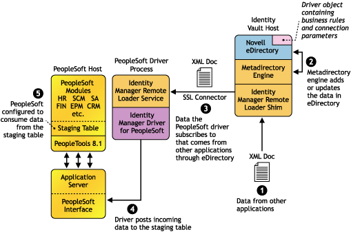 As events occur within eDirectory, the driver receives an XML document from the Metadirectory engine and updates PeopleSoft. By configuring the filter on the Subscriber channel, you can specify what data you want updated in PeopleSoft. The driver uses the Schema CI and updates a staging table inside the PeopleSoft environment.