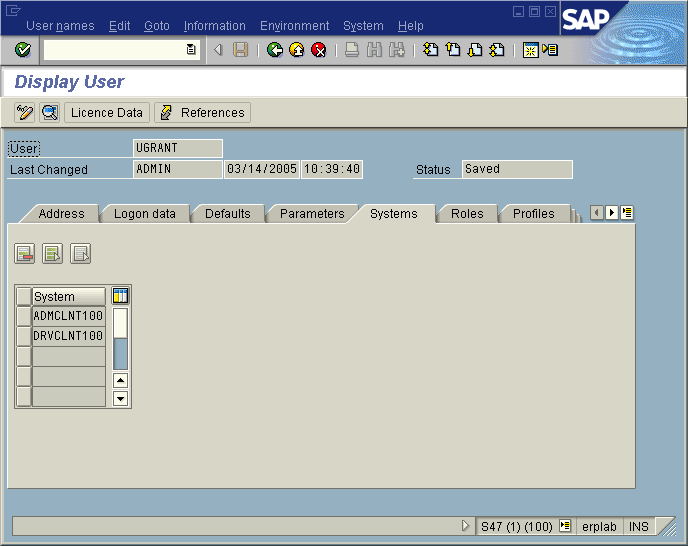 The User Maintenance transaction in SAP is SU01. The major difference between the maintenance options in a CUA environment and a non-CUA environment is the existence of the tab. The entries under this tab indicate which logical systems to which the User account information should be distributed. The following illustration shows a User that is distributed to logical systems ADMCLNT100 and DRVCLNT100.