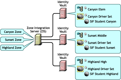In this example there are three Zones, one per school. Identity Manager and the Identity Manager Driver for SIF are installed on a server that holds replicas of the partitions from each school. One driver is configured to connect to all three Zones.