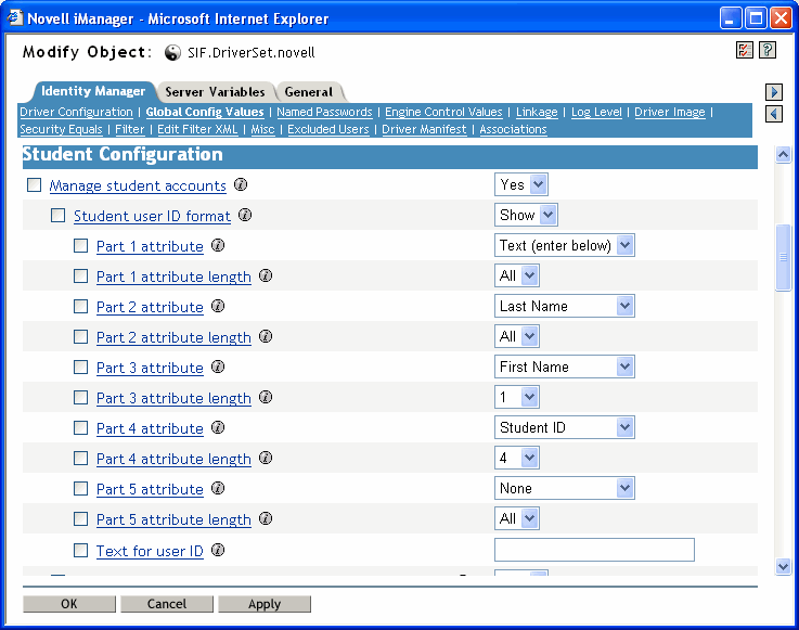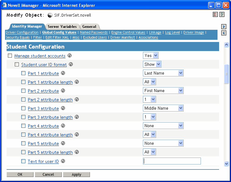 The driver configuration gives you a lot of flexibility in specifying the pattern for creating User IDs. You specify one pattern for student User IDs and a separate pattern for creating staff User IDs. You can create User IDs that are a combination of up to 5 parts.