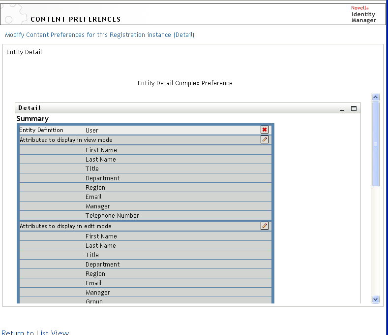 Specifies the attribute list and HTML layout to display when Detail is used for a particular entity type (such as User, Device, or Group). You can click to specify Detail support for additional entity types. |