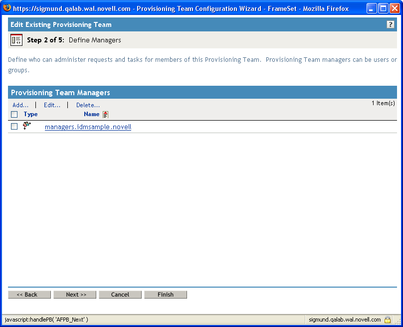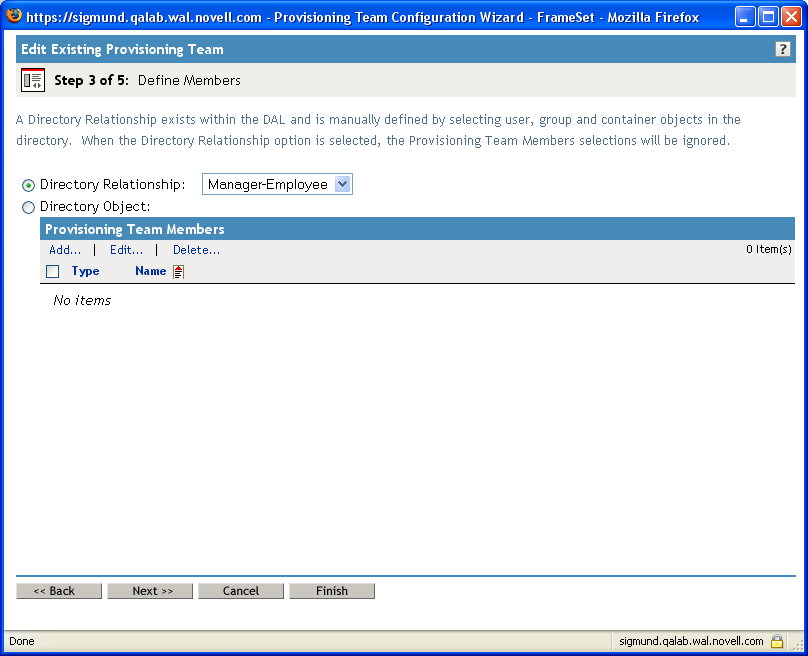 To identify the associated team, select the DirectReports provisioning team you created earlier. When you select this team, the iManager interface shows you the settings for the team.