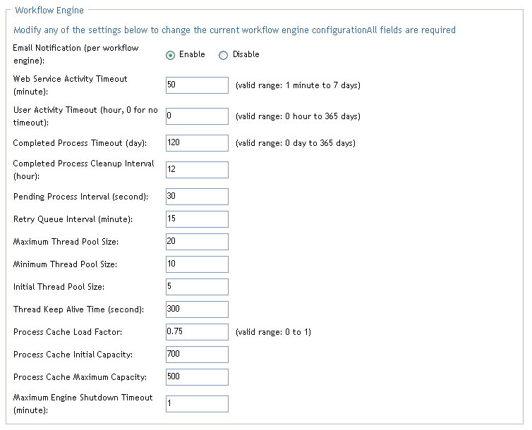 This section provides instructions on configuring the Workflow Engine and on configuring cluster settings. These settings apply to all engines in the cluster. When any of these settings are changed, other engines in the cluster will detect these changes in the database and use the new values. The engines check for changes to these settings at the same rate as specified by the pending process interval.