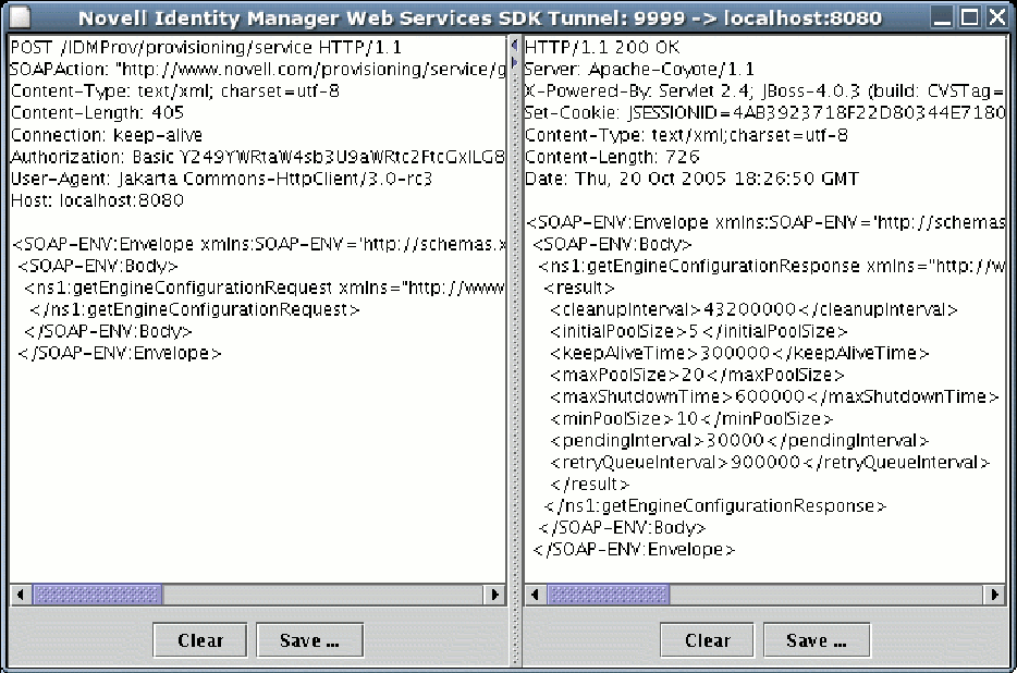 Figure 20-4 shows the TCP tunnel with a request SOAP message in the left panel and the message in the right panel.