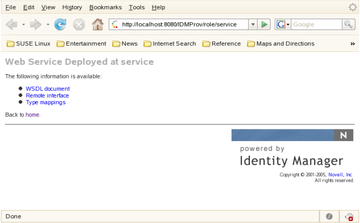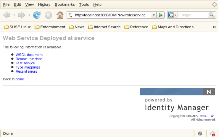 When a user reaches this servlet using a HTTP GET by entering http:// server-name/ context/role/service (for example, http://localhost:8080/IDMProv/role/service) in their browser, the WSSDK provides a page that exposes some information about the deployed service. By default the page looks like this:
