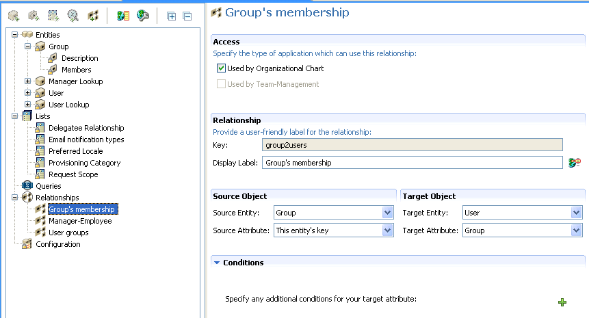 The relationship you define can be between like entities (such as user/user) or unlike entities (such as user/device). You can define conditions for the relationship to further refine it. For example, you might want to create a condition that shows all Manager-Employee relationships and then refine it to show only employees in one particular region, or show all the subordinates of a vice president located in the eastern region.