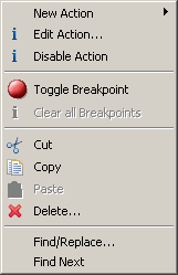 From this menu, you can add or edit actions (see Section 8.5, Actions), toggle breakpoints in the action model (see Animation) and perform other tasks.