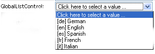 Use this control to allow users to select a single entry from a drop-down list. The contents of the list are defined in a directory abstraction layer global list element.