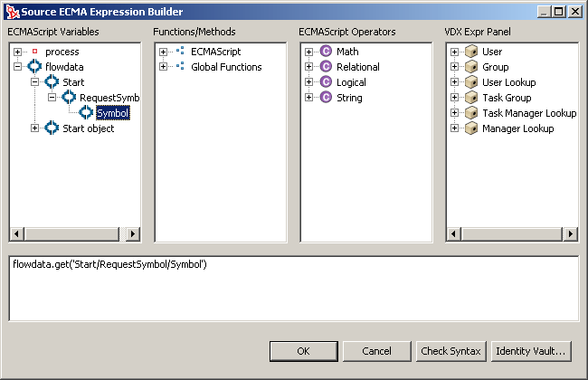 Expand the node in the pane of the ECMA expression builder, then double-click the flowdata variable that will receive data from the Web service.