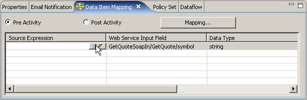 For example, if you have created a form field called “symbol” to accept a stock symbol for input to the Web service, you would go to the post-activity data item mapping for the activity associated with the form that contains the field, then you would map the field to a flowdata variable (for example, flowdata.symbol).