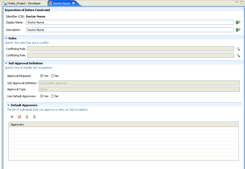 Each SoD constraint represents a rule that makes two roles mutually exclusive. If a user is in one role, they cannot be in the second role, unless there is an exception allowed for that constraint. You can define whether exceptions to the constraint are always allowed or are only allowed through an approval flow.