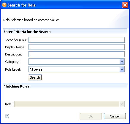 You can enter a value for all of the fields or none of the fields. If you do not supply a value in a particular field, the search returns all of the possible values for that field. If you enter one or more of the fields, the values are ANDed together to create the search filter. The search occurs on the roles defined locally. Roles matching the search criteria are displayed in the selection list.