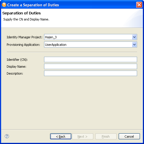 The name of the Identity Manager project and the provisioning application where you want to create the SoD. NOTE:These two fields only display when you launch the wizard from the menu. |