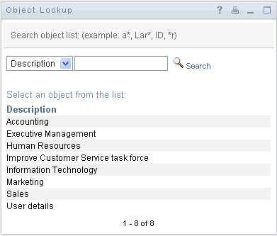 Click a user name or group name to select it. The following sample of the object lookup page was a lookup of all groups: