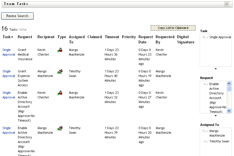 For example, if you click Margo’s name in the Assigned To filter and Kevin’s name in the Requested By filter, you see only tasks that are both assigned to Margo Mackenzie and requested by Kevin Chester, as shown in Figure 12-4:
