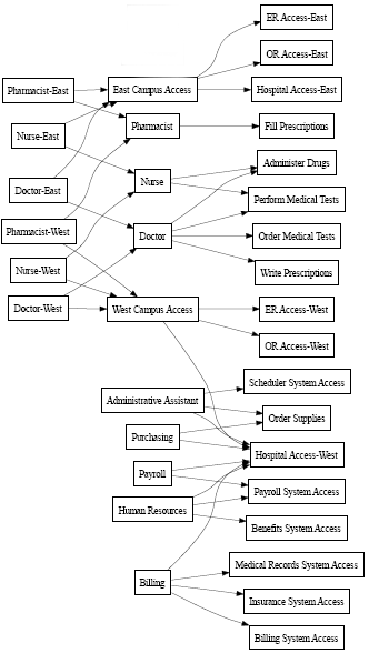 The roles hierarchy supports three levels. Roles defined at the highest level (called Business Roles) define operations that have business meaning within the organization. Mid-level roles (called IT Roles) supports technology functions. Roles defined at the lowest level of the hierarchy (called Permission Roles) define lower-level privileges. The following example shows a sample role hierarchy with three levels for a medical organization. The highest level of the hierarchy is on the left and the lowest level is on the right: