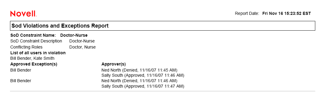 Figure 18-4 Sample SoD Violations and Exceptions Report
