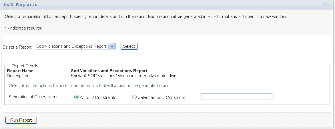 Choose to show any violations and exceptions outstanding across all SoD constraints. Or, choose to focus the report on violations of a single SoD constraint.