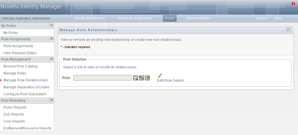 The action on the tab of the Identity Manager user interface allows you to define how roles are related in a higher and lower role containment hierarchy. This hierarchy enables you to group permissions or resources contained by lower-level roles into a higher-level role that makes assignment of permissions easier. The allowed relationships are: