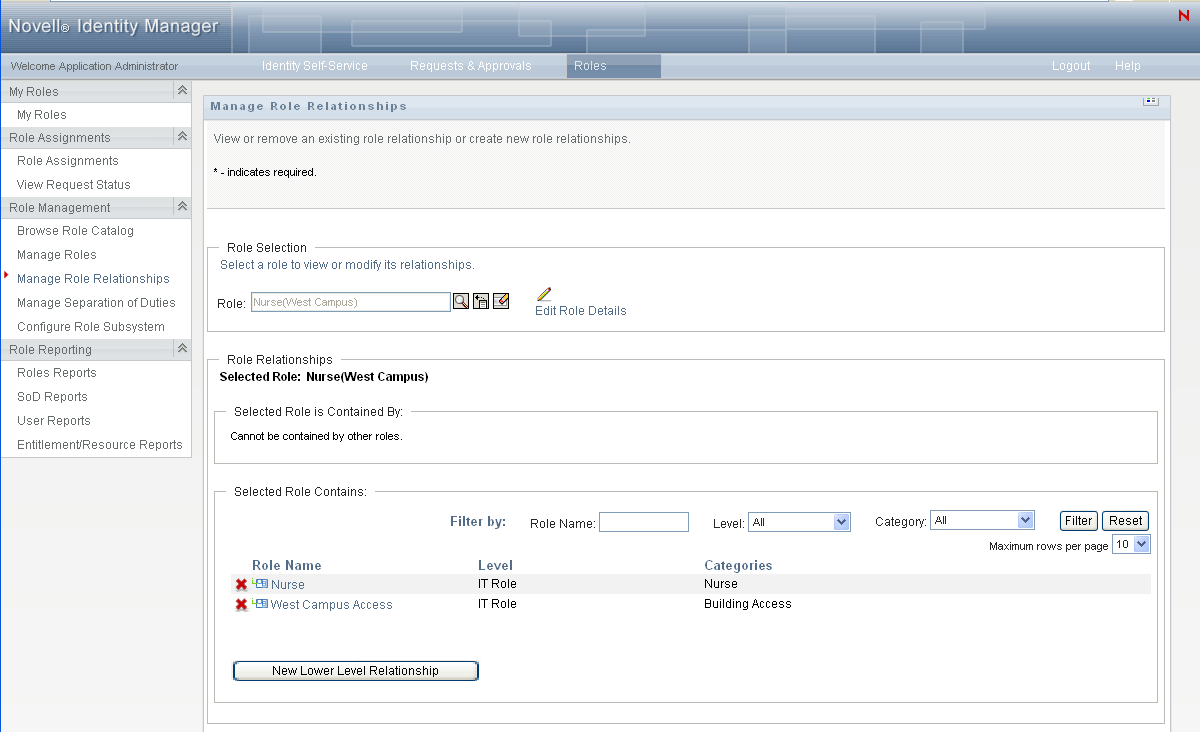 Mid-level roles (IT roles) can contain lower-level roles, and they can be contained by higher-level roles. The Role Relationship page allows you to add either New Lower Level Roles or New Higher Level Roles.