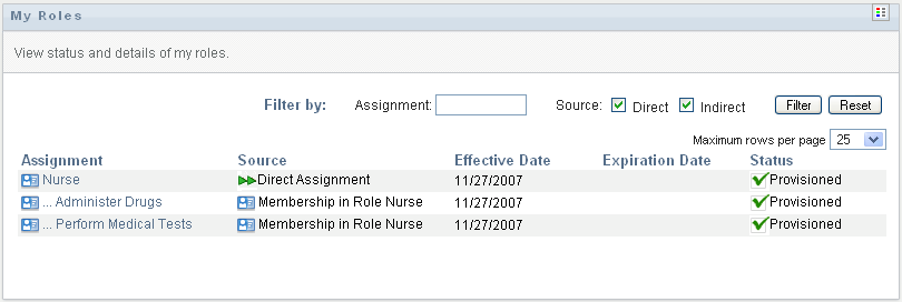 The action lets you look at the status and details for your approved roles. It shows roles that have a status of Provisioned or Pending Activation, but not role requests that have not yet been approved.