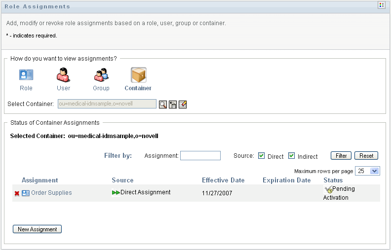 3. To view only those assignments that were assigned indirectly, select the Indirect box. Indirect assignments are those assignments that a user receives through a role relationship, or by being a member in a group or container.
