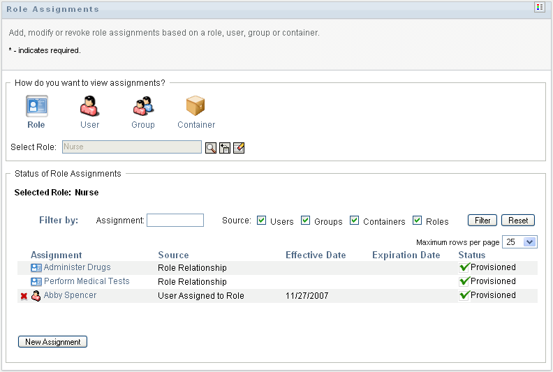 NOTE:The Role Assignments action allows you to see roles that are related to the currently selected role, but does not permit you to create role relationships. To do this, you need to use the Manage Role Relationships action.