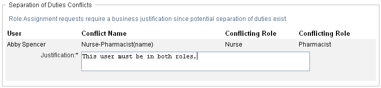 If a separation of duties conflict will occur if a role is assigned to one or more users, the user interface displays the Separation of Duties Conflicts box at the bottom of the page. In this case, you need to provide a business justification for the role assignment.