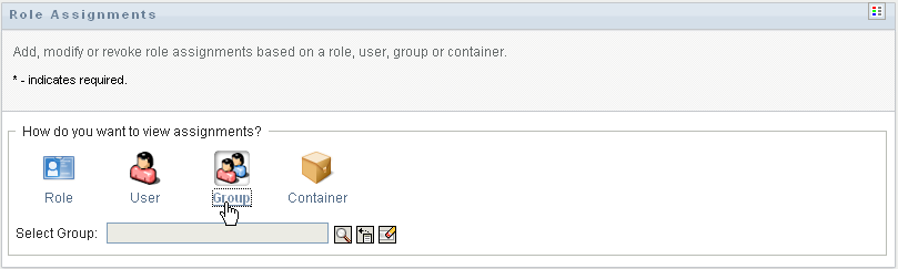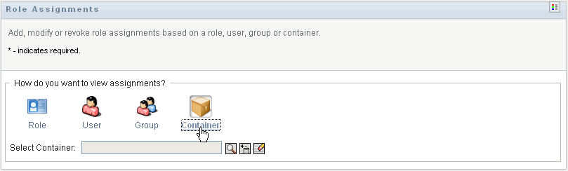 • In the Type of Assignment drop-down, select User, Group, or Container to indicate what type of object you want to assign to the currently selected role.