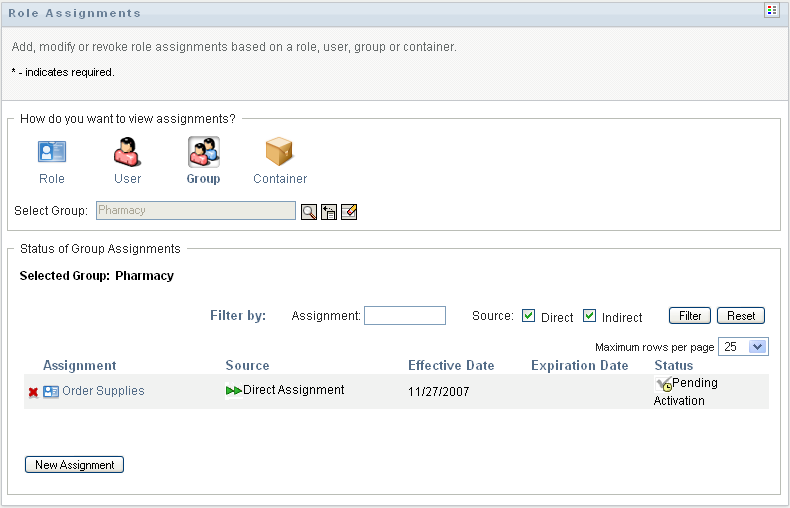 3. To view only those assignments that were assigned indirectly, select the Indirect box. Indirect assignments are those assignments that a group receives through a role relationship.