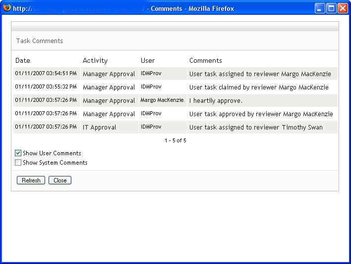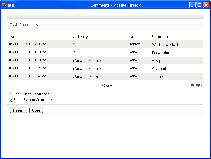 A pop-up window lets you see user and system comments. The order in which comments appear is determined by the time stamp associated with each comment. Comments entered first are displayed first. For parallel approval flows, the order of activities being processed concurrently can be unpredictable.