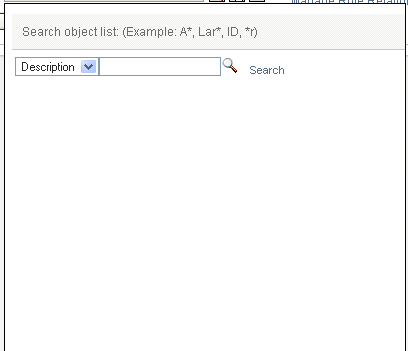 In the text box next to the drop-down list, type all or part of the search criteria (such as name or description). The search finds every occurrence of the type of object you are searching for that begins with the text you type. You can optionally use the asterisk (*) as a wildcard in your text to represent zero or more of any character. For instance, all of the following examples find the role Nurse: