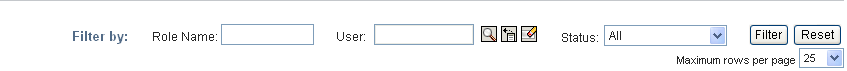 The Roles tab of the User Application provides filters so that you can display only the data that you are interested in viewing. You can additionally limit the amount of data displayed on a single page by using the Maximum rows per page setting. Some examples of filters include: