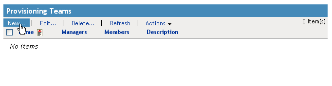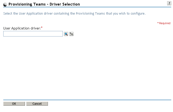 Before configuring a provisioning team, you need to select the Identity Manager User Application driver that contains the definition. After selecting the driver, you can create a new team definition, edit an existing definition, or delete an existing definition.