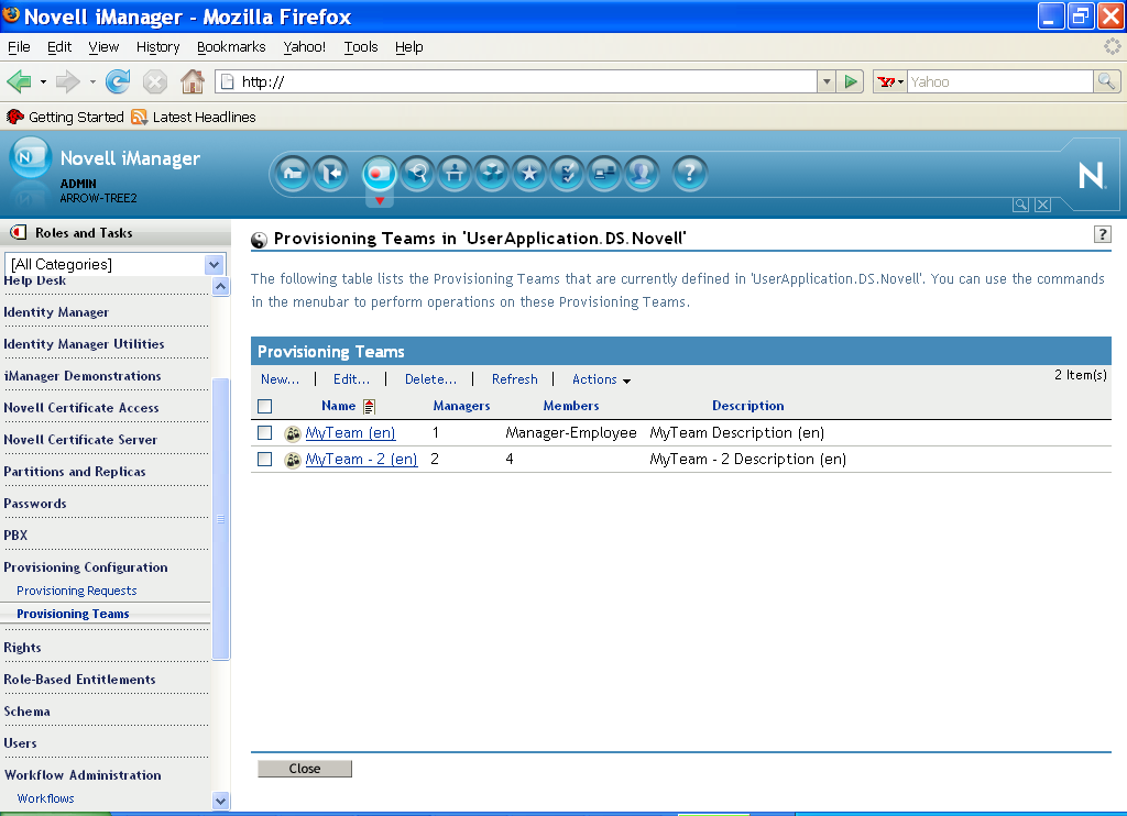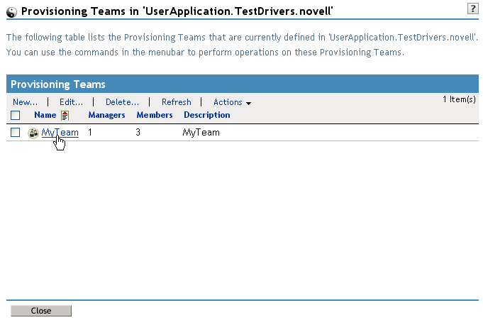 iManager displays the Provisioning Teams panel. The Provisioning Teams panel displays a list of existing team definitions.