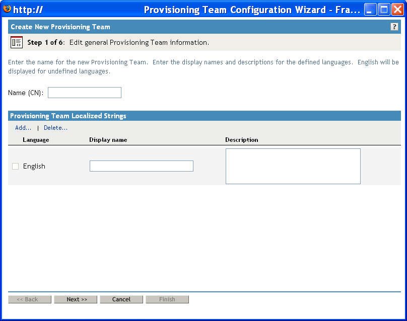 For each language you want to support in your application, click the check box beside the language in the list under , and type the localized text in the and fields. This text is used to identify the provisioning team throughout the User Application.