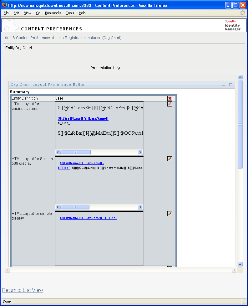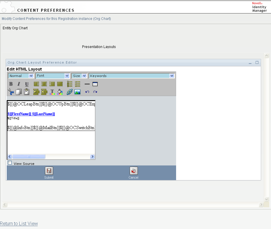 The HTML editor, available from the preferences page, provides a WYSIWYG interface for defining the layout of the leaves of the org chart. It provides the typical features of an HTML editor for defining text formatting and lists, specifying anchors and images, and so on. Use the drop-down list to place attributes, commands, and navigation URLs within the layout area. When you choose a keyword from the drop-down list, it is inserted with the proper syntax, but you can also add HTML within the layout area.