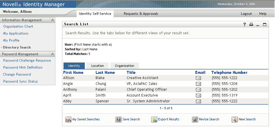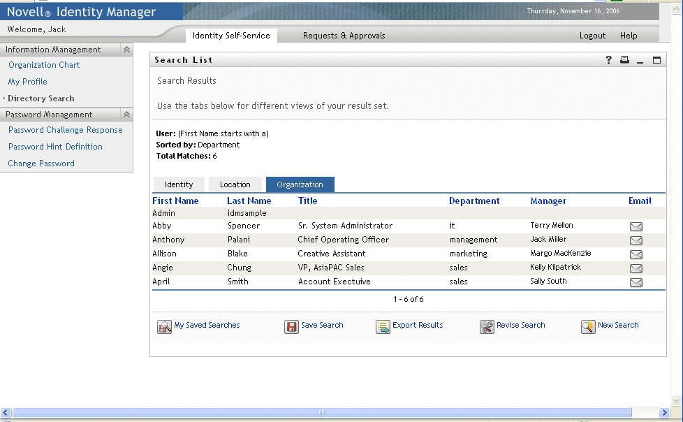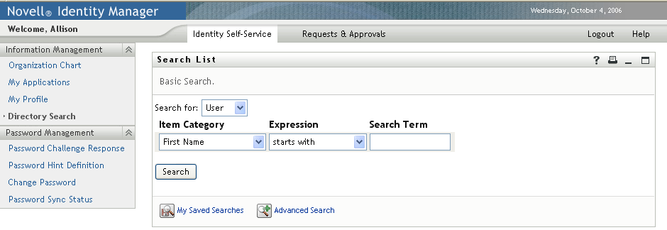 The Search List portlet allows users to search and display the contents of the Identity Vault. It is the basis for the Directory Search action of the Identity Manager User Application tab. The Directory Search action is configured to allow users to search for users and groups, but you can modify it to change the scope of searchable objects and attributes.