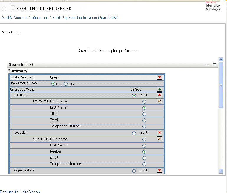 Specifies the display format (such as Identity, Location, or Organizational pages) and includes the set of attributes to include for the type. To remove a Results List Type: