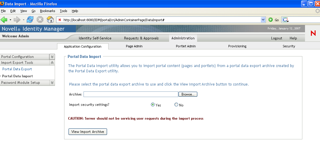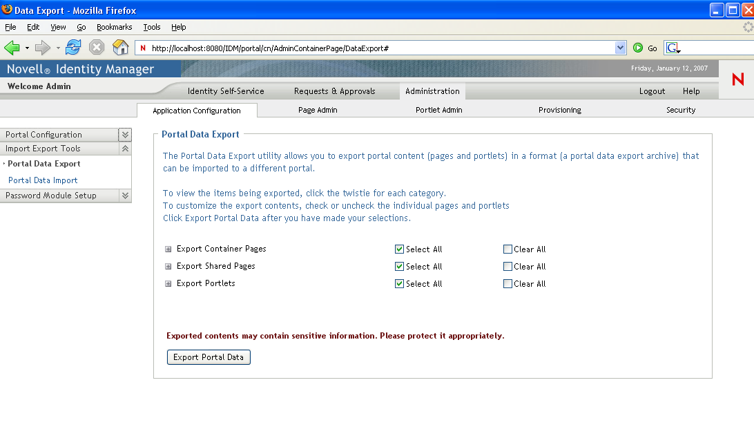 To use the Portal Data Export and Import tools, make sure that the Identity Manager User Application (portal) is deployed and running on your source and target application servers.