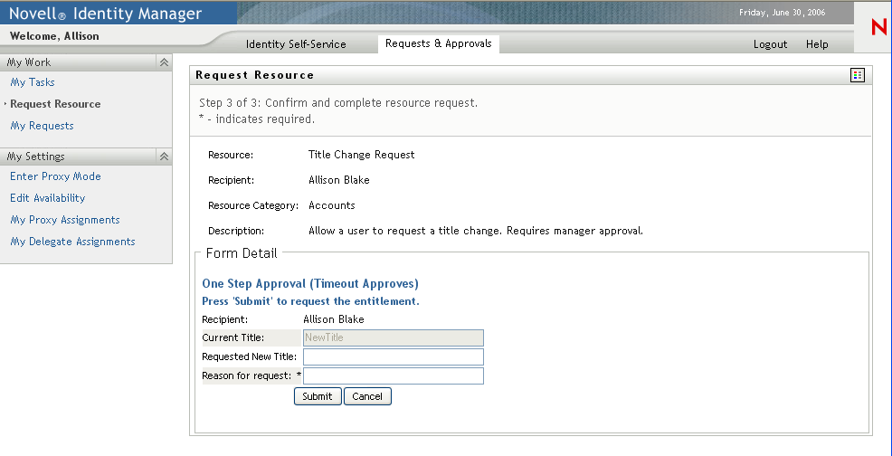 Forms allow the user to request a resource, approve a resource request, and work on a task. They are available when the user chooses any of the actions in the category of the User Application’s tab. Forms are also available directly from a URL. For details on this technique, see Section 5.9, Providing Direct Access to a Form.
