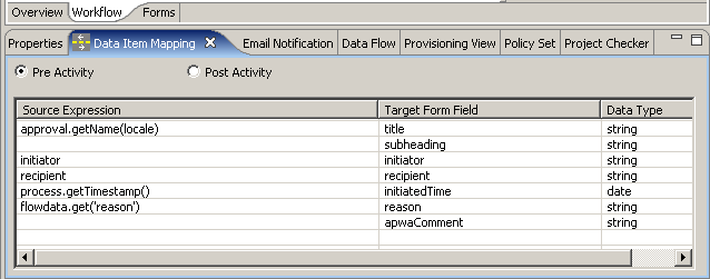 You use the Data Item Mapping view to map data from the data flow into fields in a form (pre-activity mapping) and to map data from the form back to the data flow (post-activity mapping).