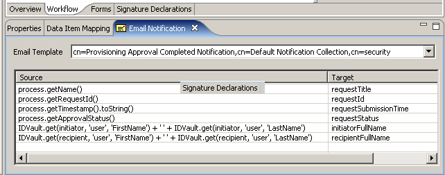 You use the view to select an e-mail template, and to specify expressions to provide values for named parameters included in the e-mail template. E-mails are sent when a new Approval activity starts (to notify approvers that they have work to do) and when the Finish activity completes (to notify the initiator that the workflow is done).