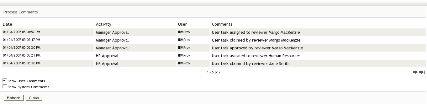 Each activity has a default name. We strongly recommend that you replace the default names of activities with names that describe the specific purpose of the activity in the workflow. This makes it easier to understand the workflow when you look at the graphical display of the workflow. It also makes comments displayed in the User Application easier to understand. For example, the following figures show comments in the User Application using default IDs and descriptive IDs.