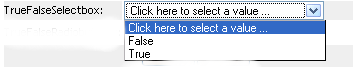 Use this control to display a choice of True or False in a drop-down list. The text “Click here to select a value” displays only when the field is not required.
