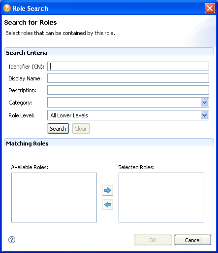 You can enter a value for all of the fields or none of the fields. If you do not supply a value in a particular field, the search returns all of the possible values for that field. If you enter values in one or more of the fields, the values are ANDed together to create the search filter. The search occurs on the roles defined locally, not the roles deployed to the driver.