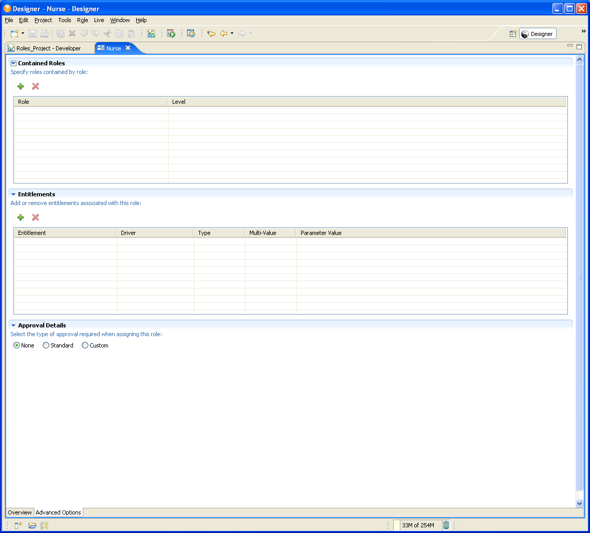 For more information on completing the Contained Roles section, see Specifying a Role Hierarchy. For more information on how to use the Entitlements section, see Specifying Entitlements.