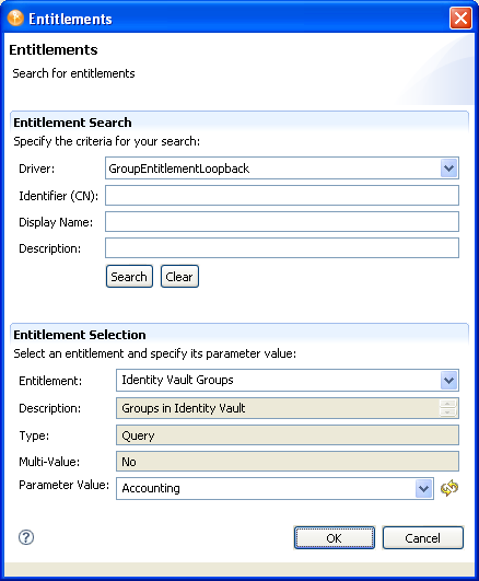 You can enter a value for all of the fields or none of the fields. If you do not supply a value in a particular field, the search returns all of the possible values for that field. If you enter values in one or more of the fields, the values are ANDed together to create the search filter. The search occurs locally. Entitlements contained by the selected driver that match the search criteria are displayed in the Entitlements Selection section.