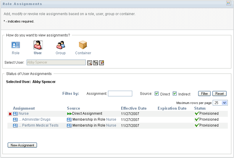 To view only those assignments that were assigned indirectly, select the box. Indirect assignments are those assignments that a user receives through a role relationship, or by being a member in a group or container.