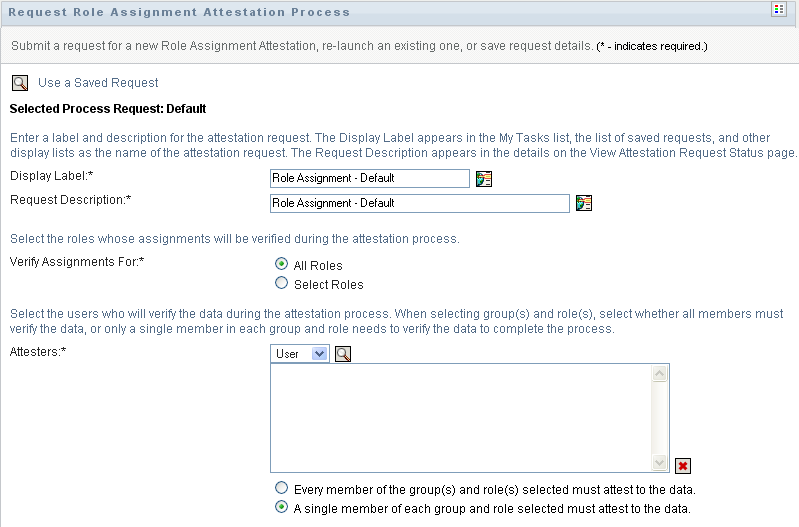 You must select at least one user, group, or role as an attester to launch an attestation process. However, you are not required to select an attester to save a request.